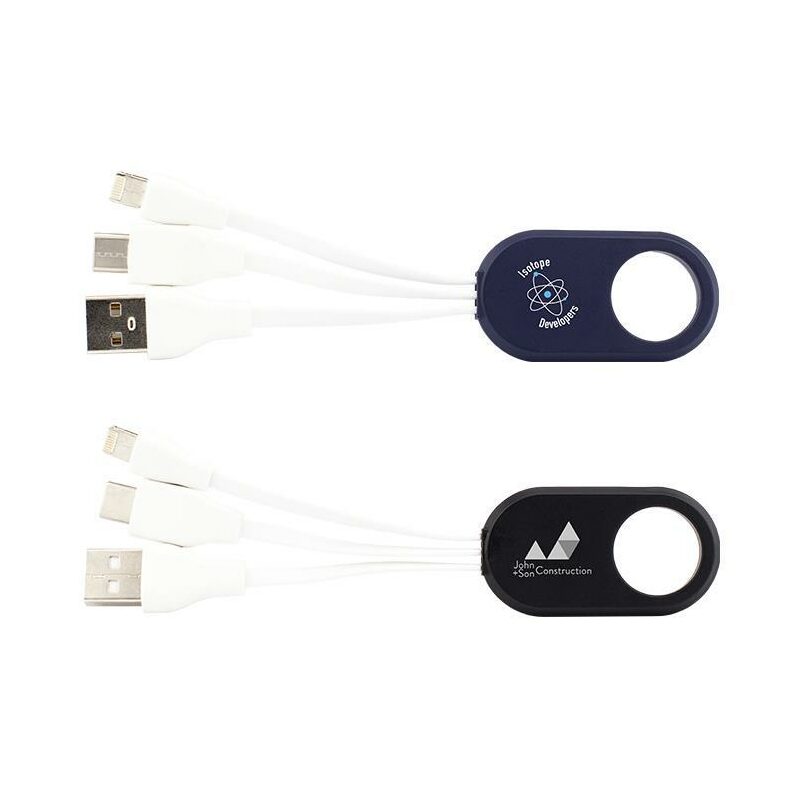 This 3-in-1 charger is compatible with 8-pin, USB-C and micro USB devices and is able to charge two devices simultaneously. The cables are attached to a plastic keychain for quick and convenient charging wherever you go. Commodity code 8544 4221.